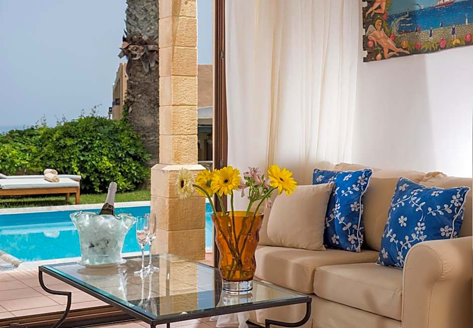 Traditional Cretan villas located right on the sandy beach. Gardens are surrounded by high walls made of stone and rock for your privacy. All villas feature small pools with hydromassage, outdoor lounge and deckchairs with soft mattresses. The master bedroom has wooden floors and is decorated in delicate fabrics. It is equipped with a satellite TV, safe and mini-bar. These villas also consist of of a second bedroom, 2 marble bathrooms with exclusive cosmetics and an intimate lounge and dining corner, also equipped with a satellite TV, safe and mini bar. Guests are offered: - a welcome drink upon arrival - 1 bottle of wine and mineral water - free use of the gym and sauna - free use of sun loungers, umbrellas and beach towels. Please note that a baby cot can be provided on request.